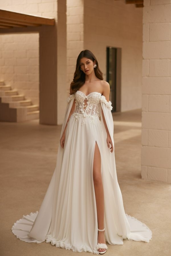 Il corpetto, con una scollatura a cuore, è arricchito da dettagli floreali in rilievo che esaltano la bellezza naturale di chi lo indossa. Le maniche, morbide e leggere, cadono delicatamente sulle spalle, conferendo un aspetto etereo e sognante. La gonna si apre con grazia in una lunghezza completa, arricchita da uno spacco audace che aggiunge un tocco moderno e sofisticato.