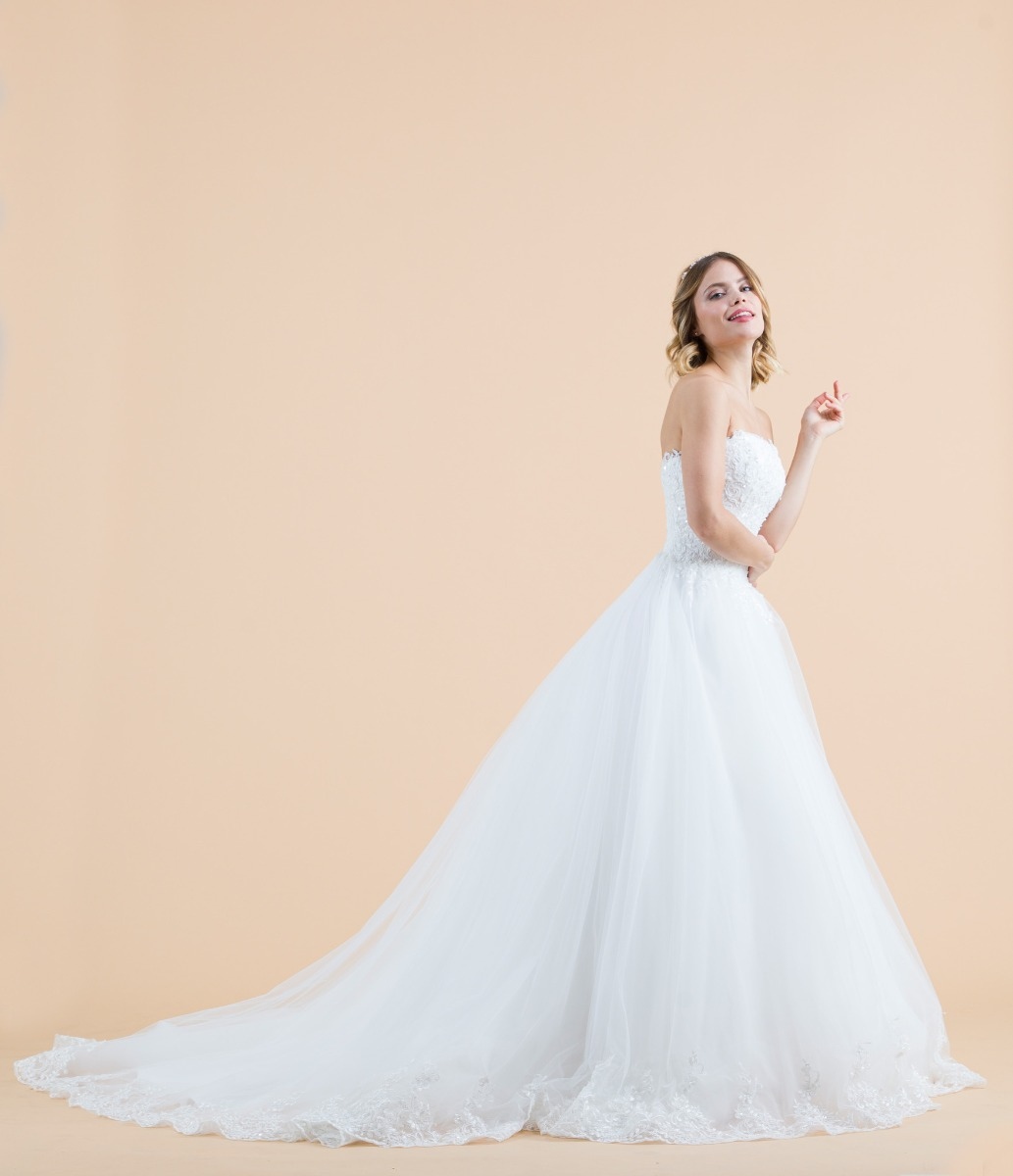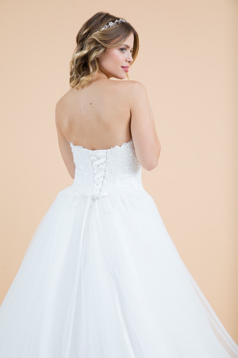Abito stile principesco realizzato con un corpino in pizzo e scollatura a onda, definito da una bellissima gonna in tulle con rifinitura in pizzo e importante strascico.