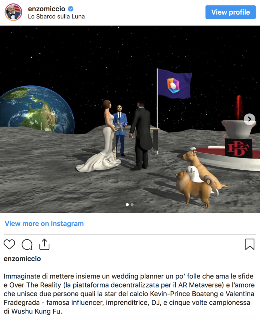 Recentemente ha fatto notizia nel mondo della cronaca rosa il matrimonio virtuale tra il calciatore Kevin-Prince Boateng con l'influencer Valentina Fradegrada. La coppia si è sposata "in carne e ossa" grazie all'aiuto del wedding planner Enzo Miccio, che ha anche organizzato la "cerimonia sulla Luna". Dopo averli aiutati a sposarsi nel Metaverso, Miccio ha condiviso lo scatto del rito virtuale.
