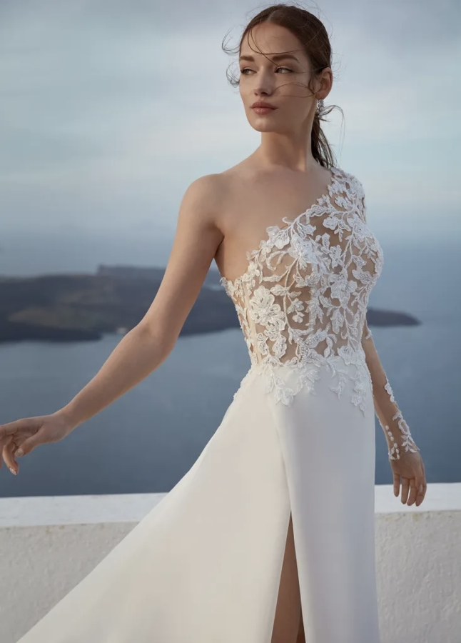Moderna e al contempo senza tempo, prevede un taglio obliquo che attraversa il décolleté. Suggeriamo i modelli monospalla a chi vuole scegliere una scollatura dell'abito da sposa che sia davvero attuale e fuori dagli schemi.