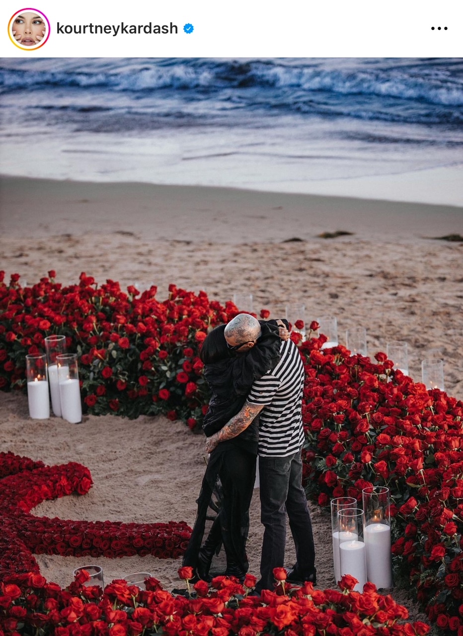 Cosa sarebbero le sorelle Kardashian senza una telecamera a riprendere ogni minuto della loro vita? La più grande delle tre, Kourtney, ha ricevuto la proposta di nozze dal musicista Travis Barker su una spiaggia californiana al tramonto con candele e centinaia di rose rosse. Alcuni giorni dopo la proposta di nozze, Kourtney Kardashian ha condiviso su Instagram altre foto del loro momento romantico sulla spiaggia, scrivendo: “Mi sono svegliata tutta la notte pensando che fosse un sogno”. La coppia si è poi sposata sia a Las Vegas sia in Italia: lei indossava un abito da sposa fashion, corto e irriverente.