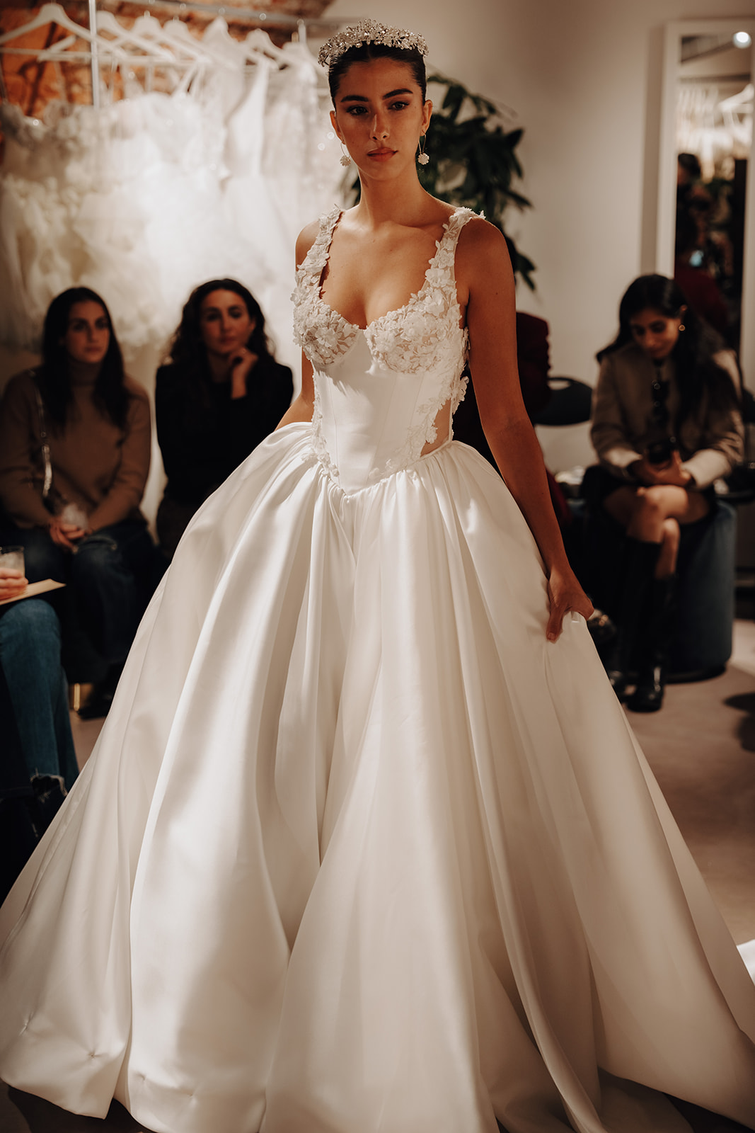 Pizzo, balze e cascate di perle, proposte su abiti da sposa corti, ci riportano allo stile spumeggiante degli anni Ottanta. Al contempo, è impossibile non cedere all’allure sofisticata dei modelli lunghi e avvolgenti, che definiscono il corpo femminile come un’armoniosa scultura. E poi, ancora, ci siamo lasciati ammaliare da ricami floreali, ampie maniche a palloncino e bustier, per un trionfo di romanticismo senza tempo.