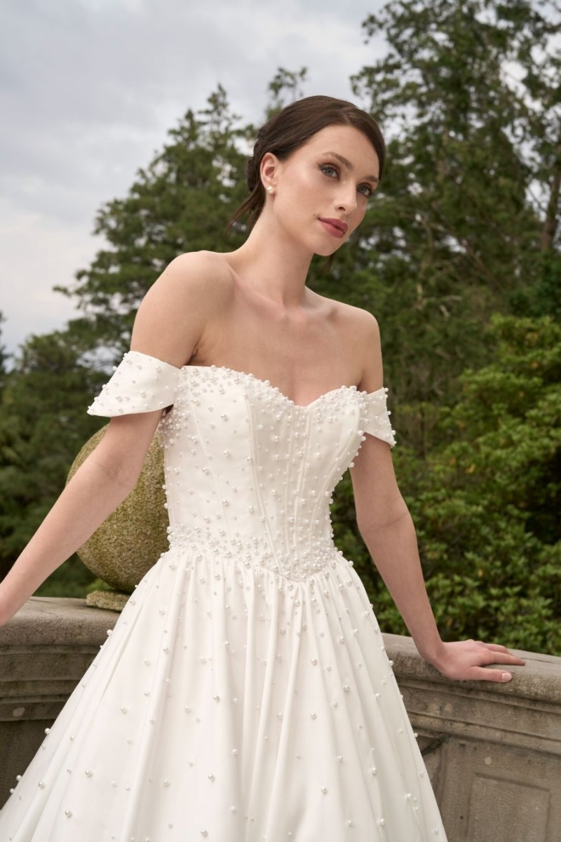 Una delle tendenze sposa 2026 che amiamo di più è la rilettura dello stile romantico in una chiave più attuale. Come? Semplice: immaginare abiti sognanti con corsetto, un vero fil rouge dei prossimi mesi. I corpetti definiscono la struttura dell’abito, sottolineano il punto vita e hanno quel certo “je ne sais quoi” che ci fa innamorare. A proposito, che ne dite di aggiungere un foulard da sposa al look nuziale? Oltre a coprire le spalle, soprattutto per chi si sposa con rito religioso, è un’aggiunta raffinata e moderna che rivoluziona il look in un semplice gesto.