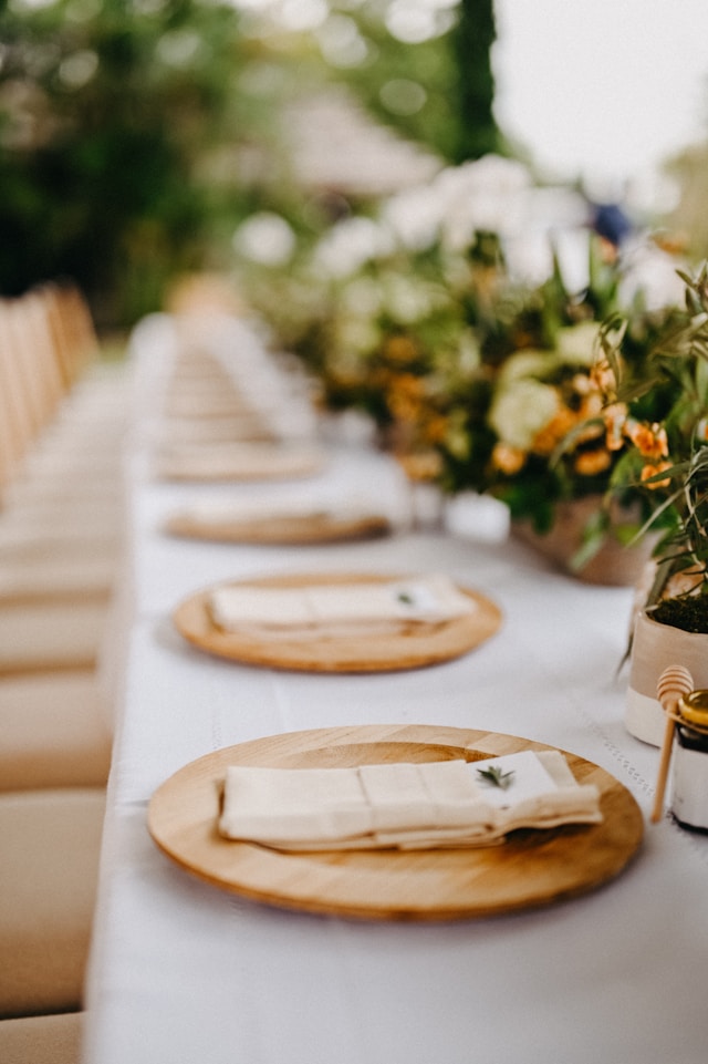 Qualsiasi elemento dell’allestimento può essere riutilizzato, dai fiori alle decorazioni. I centrotavola possono trasformarsi in doni da portare a casa, come piccole piante in vaso, barattoli di miele o spezie, mini bouquet e così via. Lasciate dei bigliettini sui tavoli del ricevimento per far sapere agli ospiti che possono portare a casa i centrotavola o i fiori.