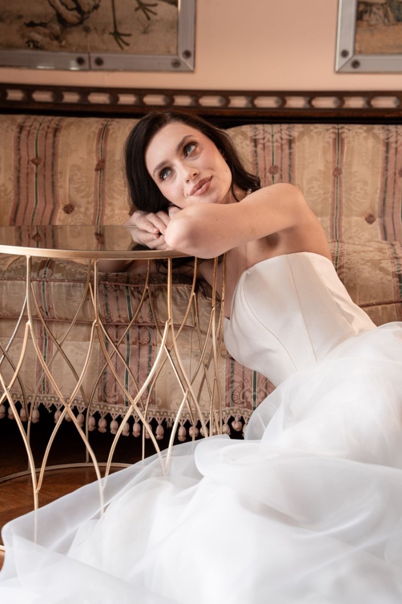 Leggero come una nuvola, questo abito conquista con la sua eleganza eterea. Il corpetto a cuore, strutturato e senza spalline, valorizza il busto con delicatezza, mentre la gonna in organza vaporosa crea volume senza appesantire, regalando movimento e poesia a ogni passo.