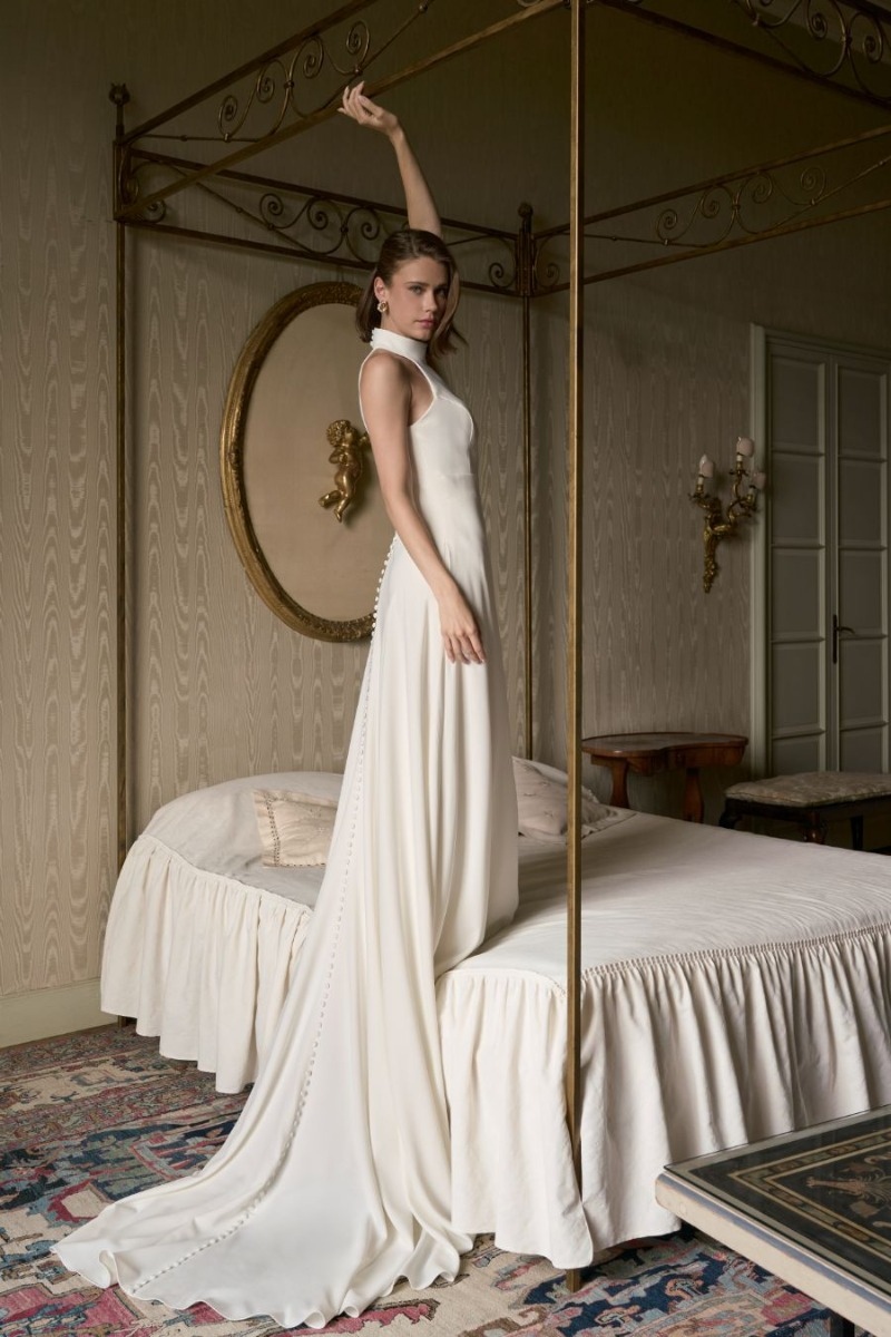 Abito in crêpe dalla linea scivolata, con collo alto e silhouette pulita. Il raffinato scollo all’americana si apre sul retro in un sorprendente taglio a goccia che valorizza la schiena. Bottoni rivestiti decorano con delicatezza lo strascico fluido, per una sposa sofisticata e moderna.