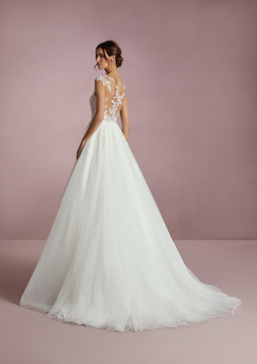 La schiena, finemente lavorata con un effetto trasparente e dettagli floreali, crea un gioco di vedo-non-vedo che esalta la bellezza della sposa in modo discreto e sofisticato. La lunghezza dell'abito sfiora il pavimento, garantendo una vestibilità perfetta per una principessa moderna.